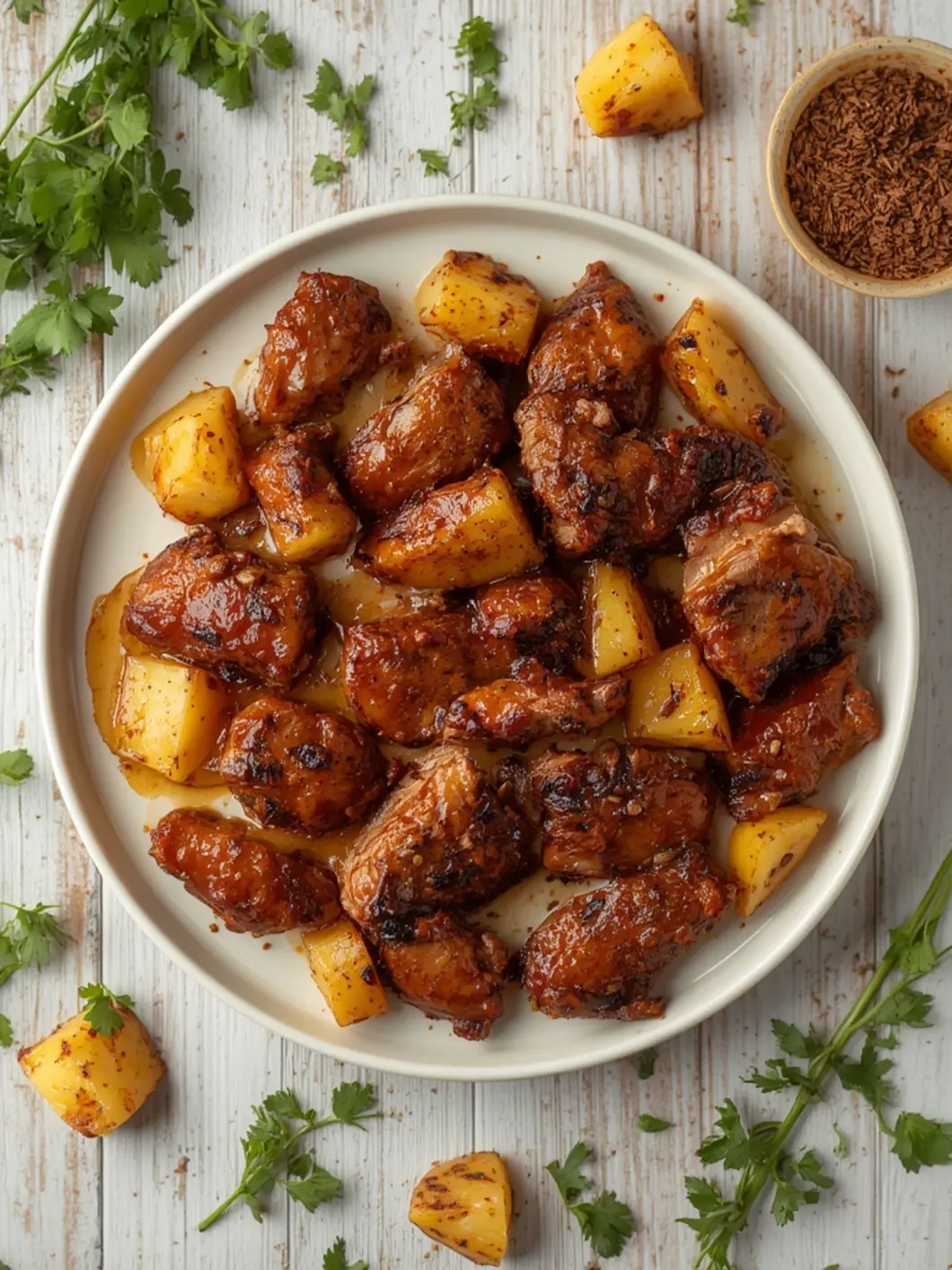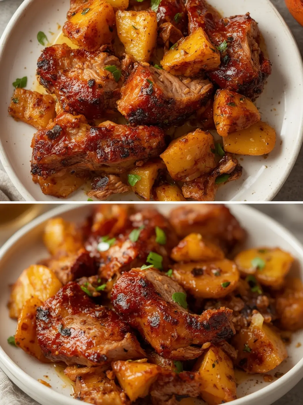 - Add pineapple chunks to the bowl and mix gently so the fruit infuses the pork with natural sweetness.