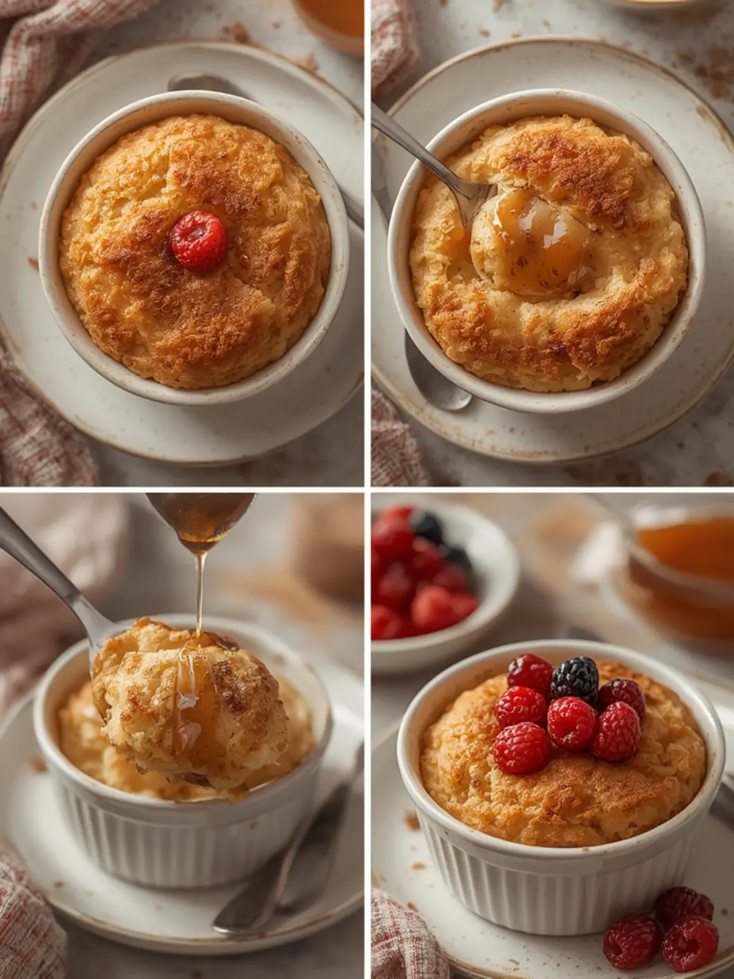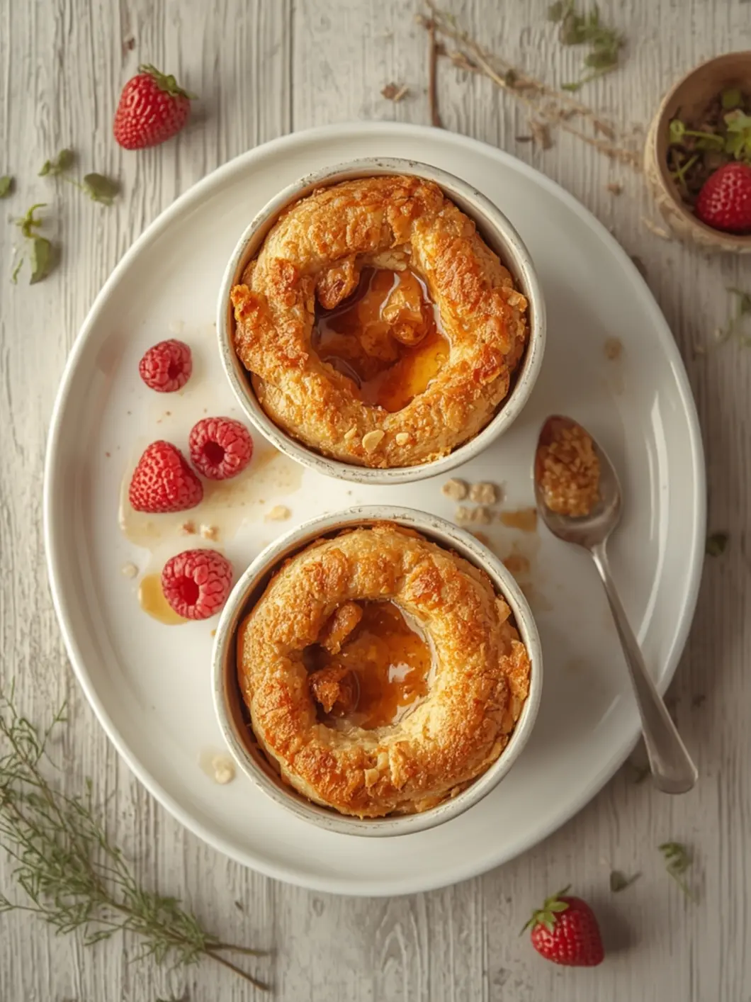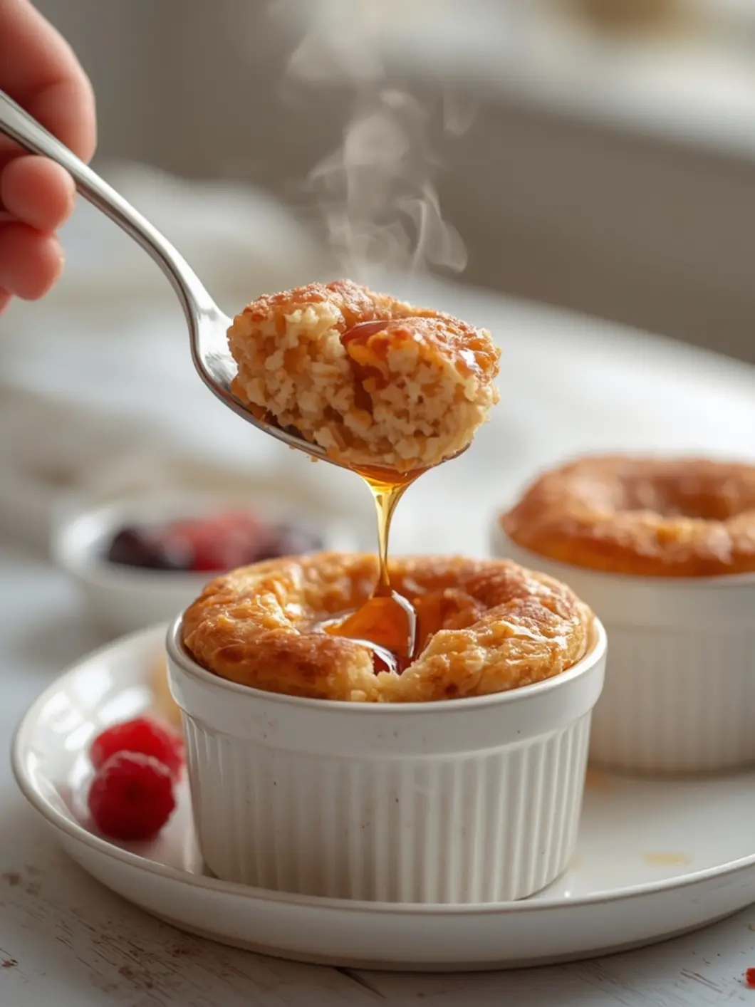 - Carefully remove the ramekins (they will be hot). Let cool for 2 minutes, then top with fresh berries and a drizzle of maple syrup.