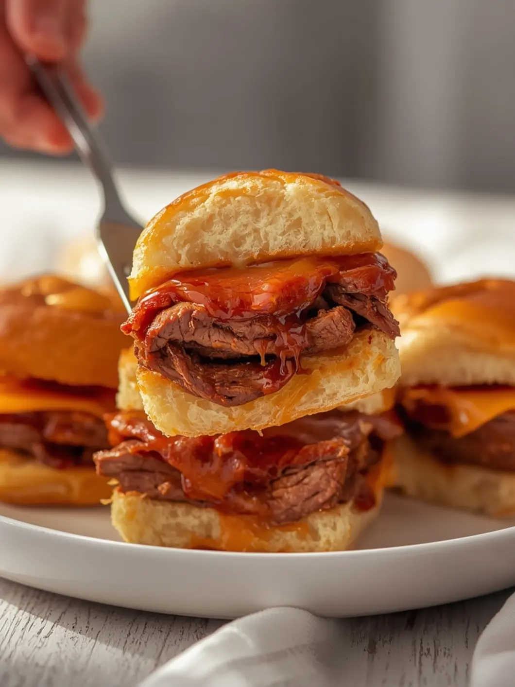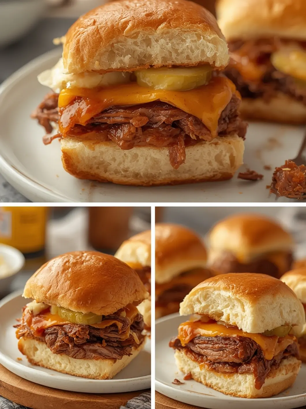 air fryer brisket sliders: Air fryer brisket sliders with glossy meat and melted cheese on soft buns