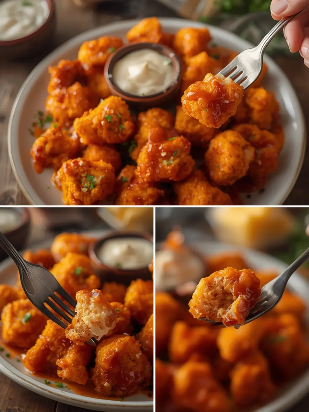 Yes. For gluten-free bites, use a gluten-free flour blend or crushed gluten-free panko instead of regular flour/panko. For a lighter batter, swap milk for unsweetened almond milk and use baking powder for extra crispness. You can also substitute the buffalo sauce with BBQ, honey garlic, or vegan-friendly hot sauces, and use plant-based butter if needed.