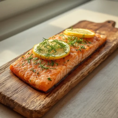 Serve with a side of roasted vegetables or a fresh salad for a complete meal. The smoky cedar flavor pairs well with lemon slices and dill as shown in the visual description.