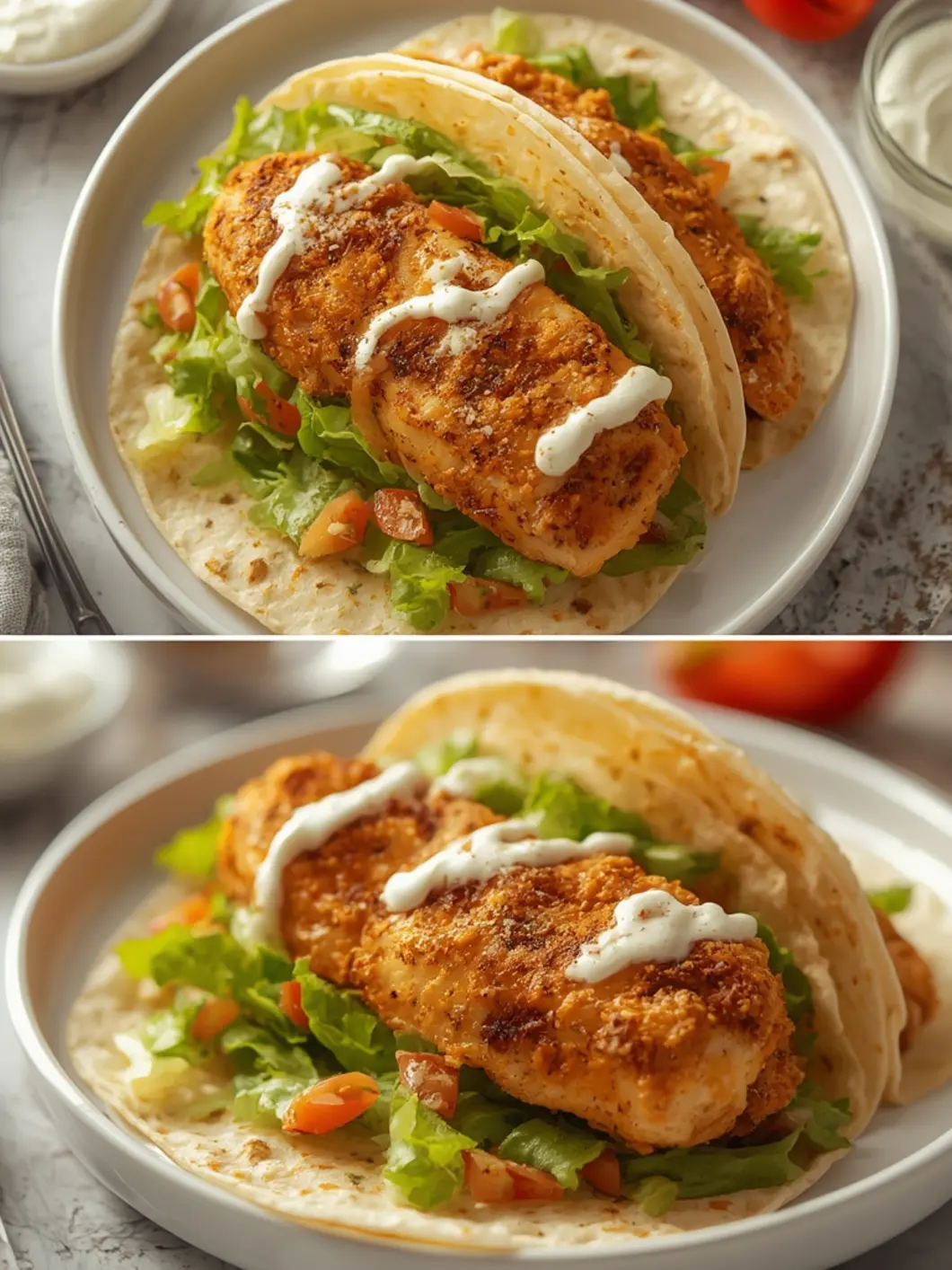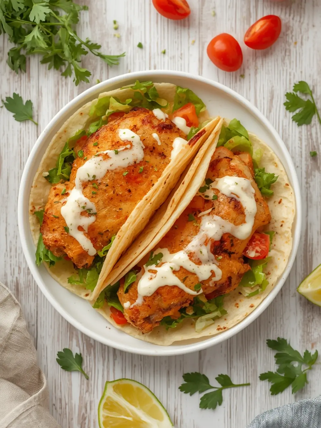 - Assemble tacos with chicken, lettuce, tomatoes, and a dollop of Greek yogurt.