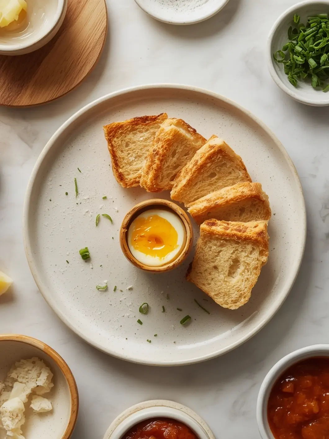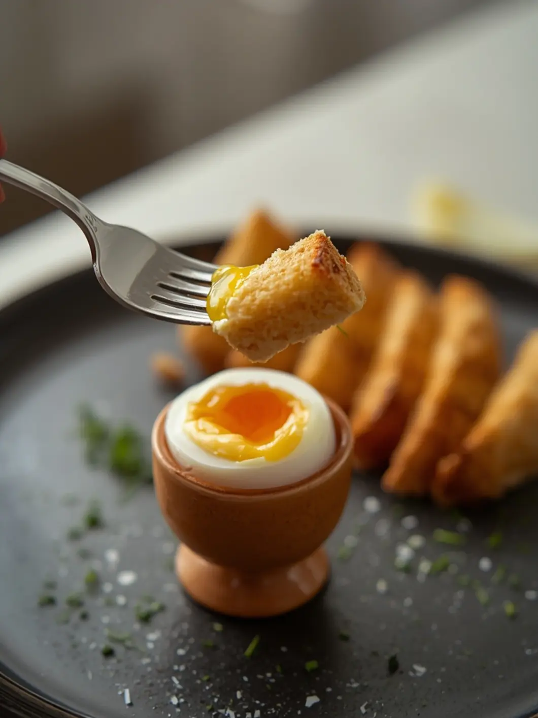 - After 6 minutes, carefully remove the hot ramekins. Use tongs to dip the toast soldiers into the soft egg yolk and enjoy immediately.