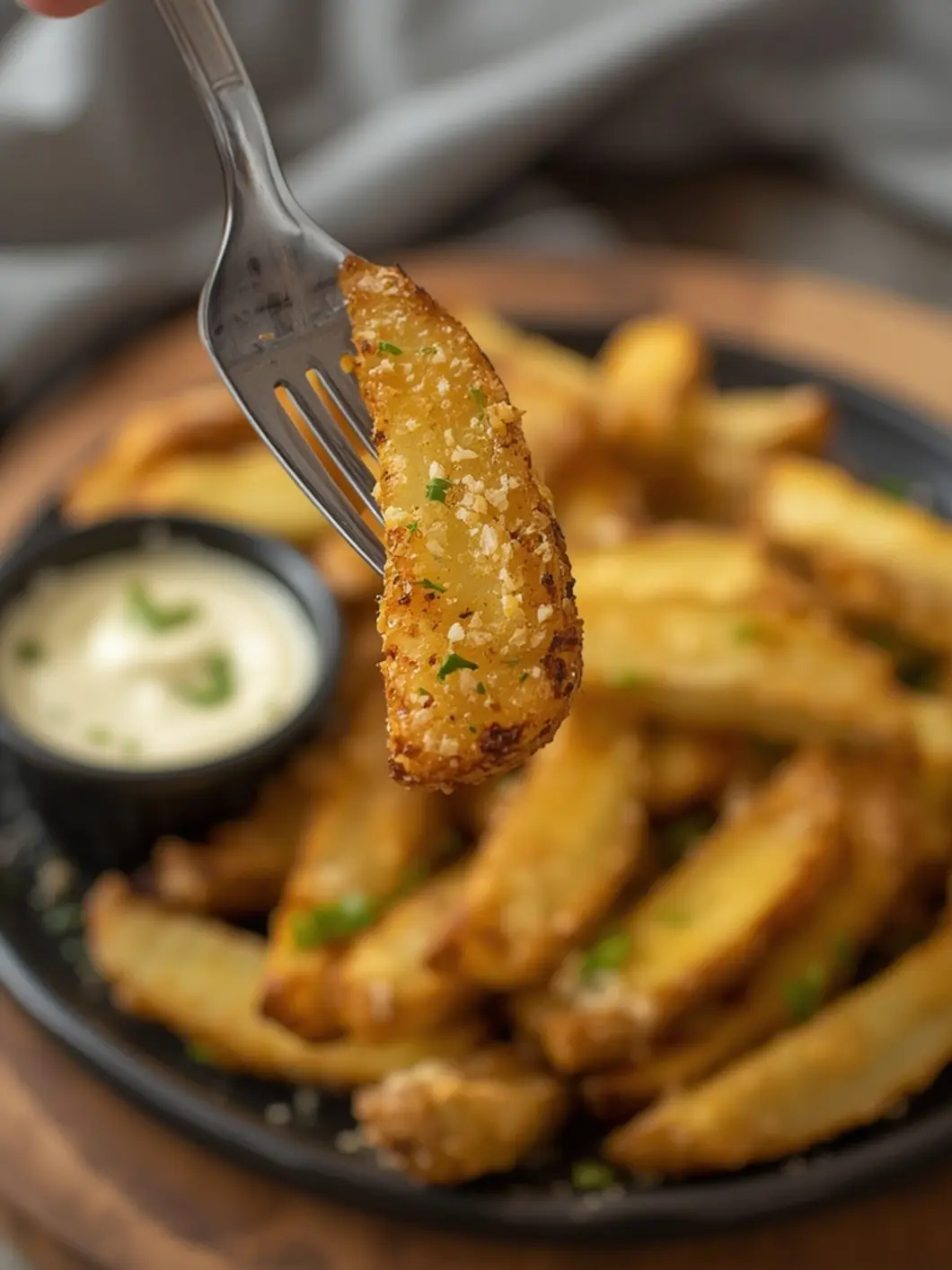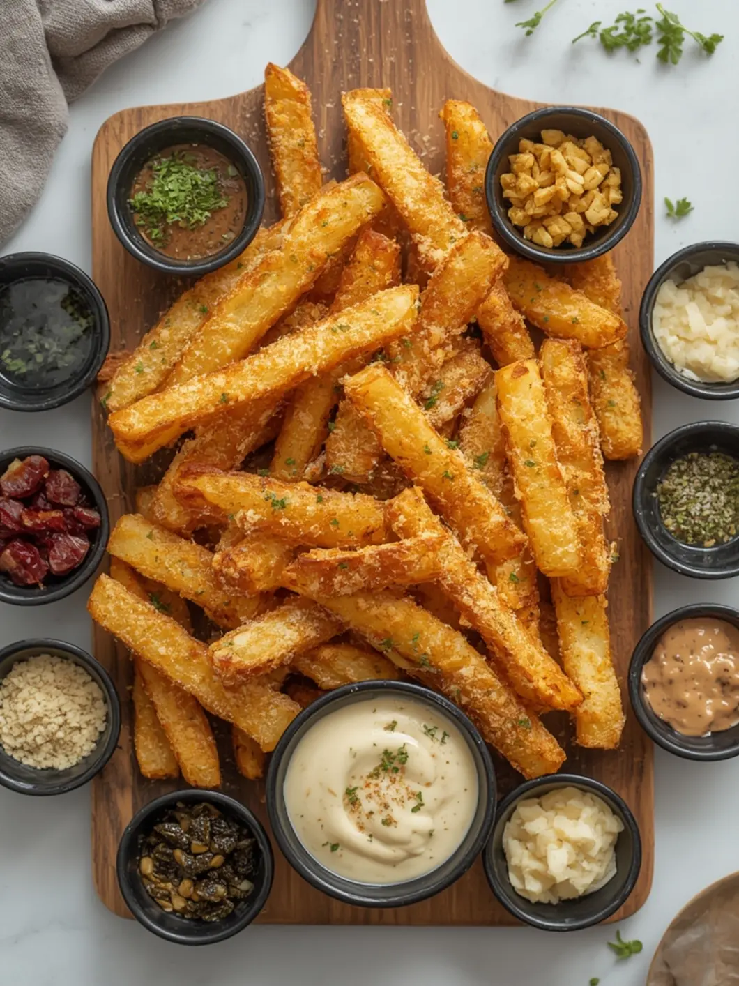 4. Add the Parmesan: Remove the fries from the Air Fryer and immediately toss them in a bowl with the grated Parmesan and fresh parsley. The residual heat will melt the cheese slightly, adhering it perfectly to the fries.