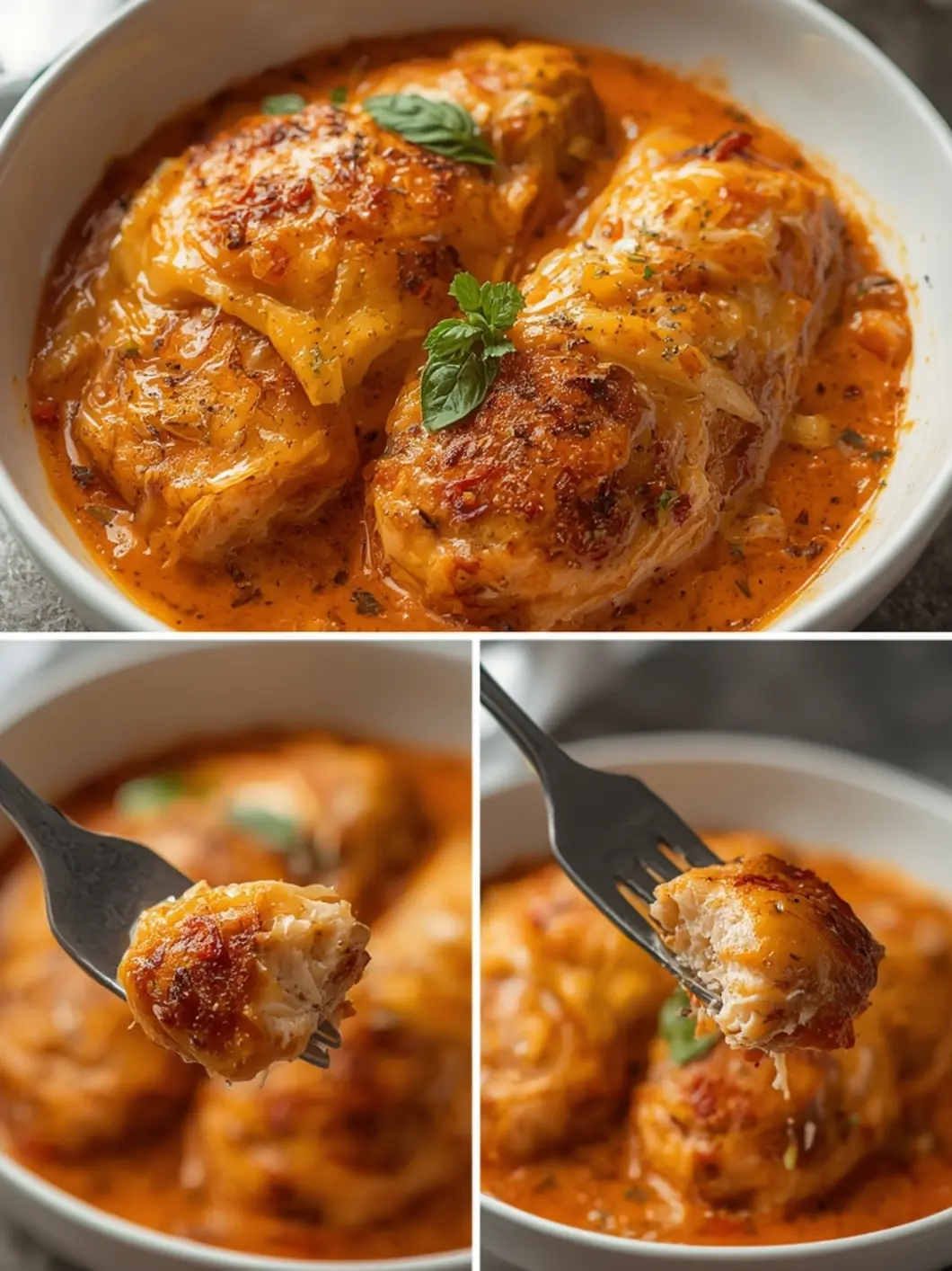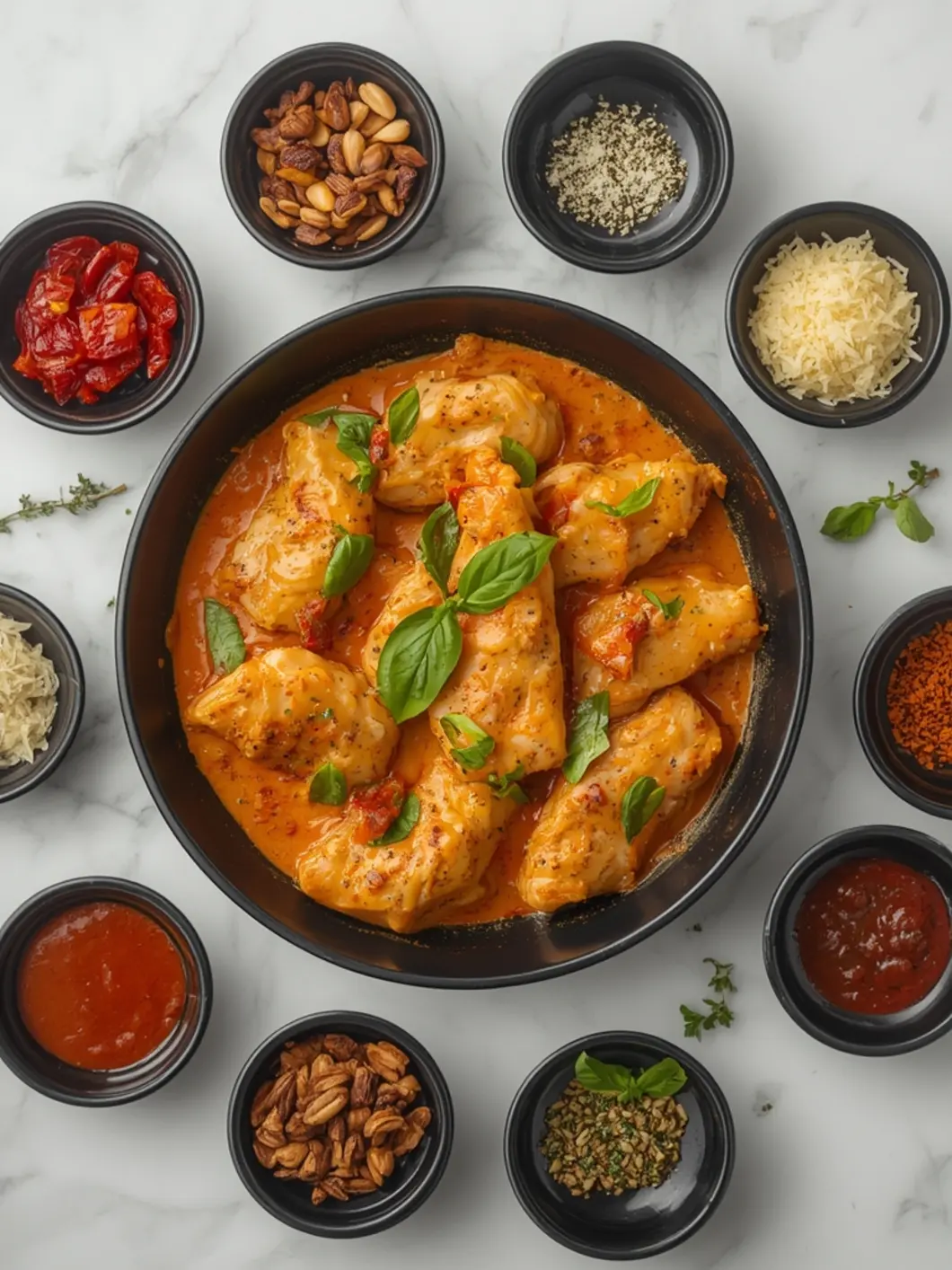• Pour the creamy sun-dried tomato sauce over the chicken and garnish with fresh basil.