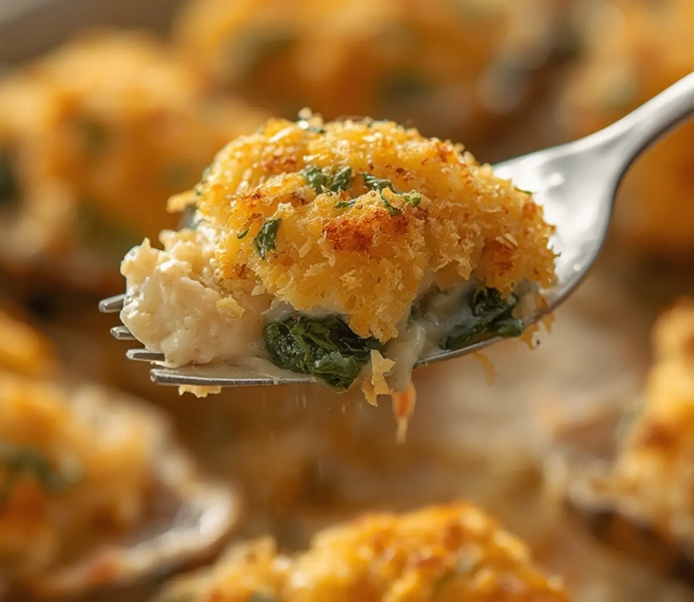 • In a small bowl, mix chopped spinach, melted butter, Parmesan, breadcrumbs, garlic, and seasonings to create the Rockefeller topping.