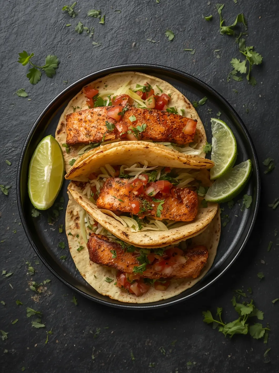 - Warm the tortillas in a dry skillet or directly in the air fryer for 30 seconds. Assemble tacos with slaw, cooked salmon, and fresh pico de gallo.