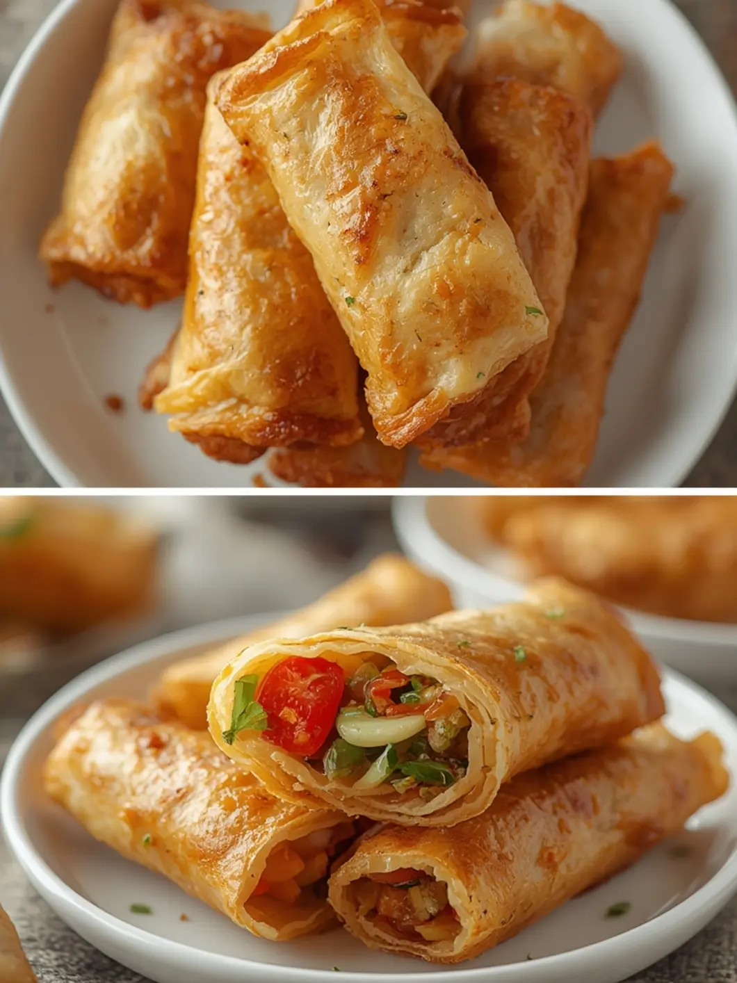 Air Fryer Spring Rolls: Extra crispy golden brown air fryer spring rolls with flaky pastry and visible vegetable filling on a plate