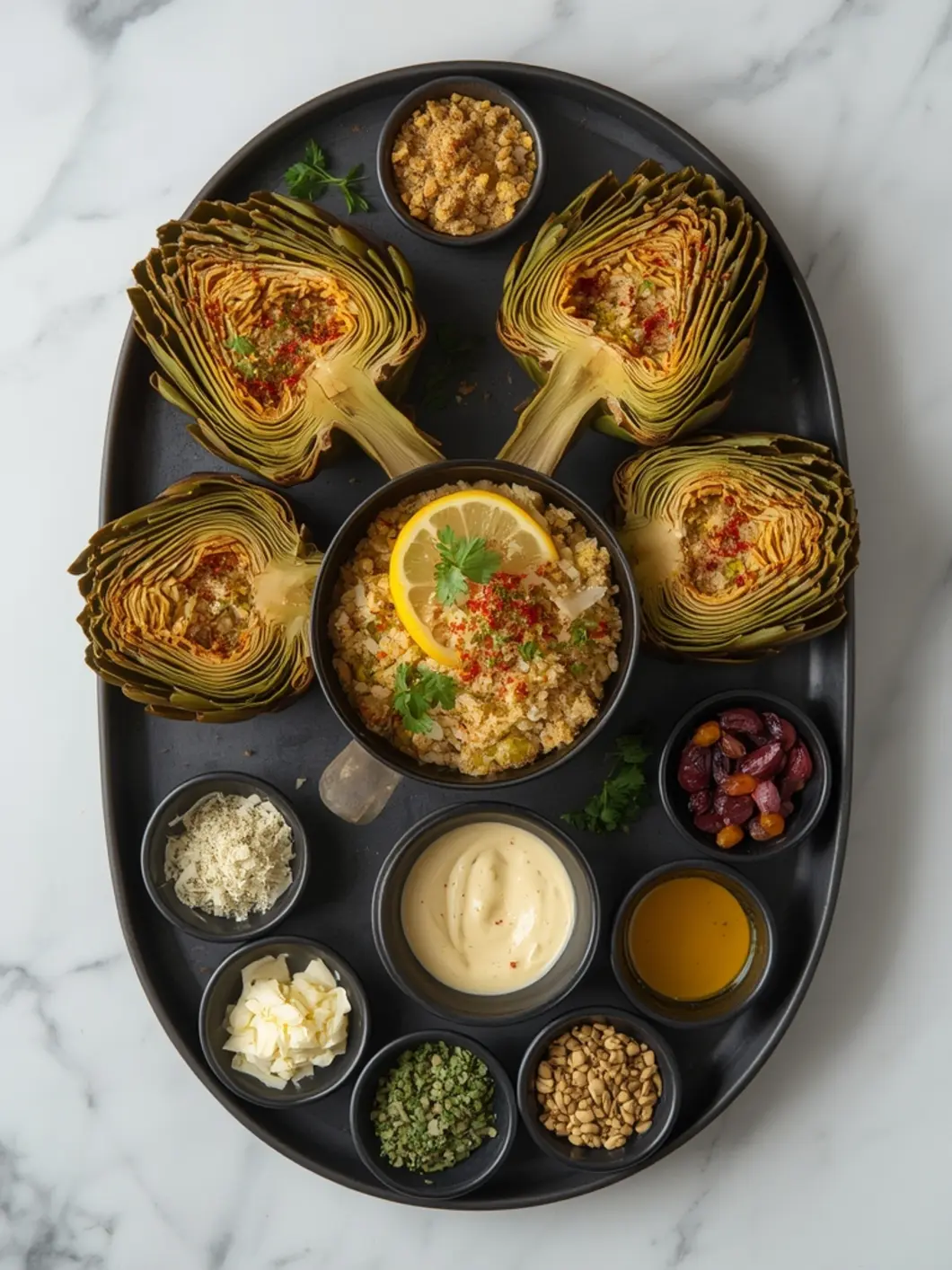 - Pack the breadcrumb mixture generously between the leaves of each artichoke, pressing gently to ensure it stays in place. Drizzle any remaining oil over the tops.