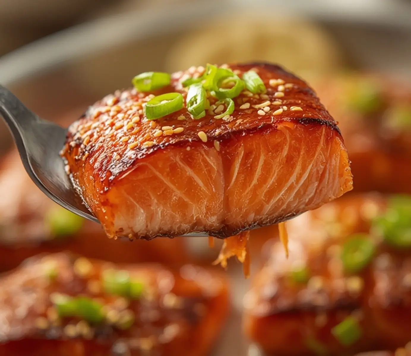 air fryer teriyaki salmon: Close up of glazed air fryer teriyaki salmon with crispy skin and sesame seeds.